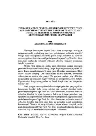 Minimnya kemampuan berpikir kritis siswa mempertegas pentingnya penggunaan model pembelajaran yang tepat serta integrasi multimedia interaktif sebagai upaya meningkatkan efektivitas proses belajar. Penelitian ini bertujuan untuk mengetahui efektivitas model pembelajaran Kooperatif tipe Think Pair Share berbantuan multimedia interaktif Articulate Storyline terhadap kemampuan berpikir kritis siswa. Metode yang digunakan adalah quasi eksperimen dengan rancangan penelitian Nonequivalent Control Group Design. Populasi penelitian berjumlah 288 siswa, dengan sampel sebanyak 72 siswa yang ditentukan menggunakan Teknik cluster random sampling. Data dikumpulkan melalui observasi, wawancara, dokumentasi,tes posttest dan pretest. Uji prasyarat analisis yang dilakukan menggunakan uji normalitas Shapiro Wilk dan uji homogenitas Levene Statistic. Hipotesis diuji dengan menggunakan uji Paired Sample t-test dan Independent Sample t-test. Hasil pengujian menunjukkan bahwa terdapat perbedaan yang signifikan kemampuan berpikir kritis siswa sebelum dan sesudah diberikan model pembelajaran kooperatif tipe Think Pair Share berbantuan multimedia interaktif Articulate Storyline di kelas eksperimen. Selain itu terdapat perbedaan yang signifikan kemampuan berpikir kritis antara siswa yang diajar menggunakan model pembelajaran kooperatif tipe Think Pair Share berbantuan multimedia interaktif Articulate Storyline dan siswa yang diajar menggunakan model pembelajaran konvensional. Temuan ini mengindikasikan bahwa adanya pengaruh model pembelajaran Kooperatif Tipe Think Pair Share berantuan Multimedia Interaktif Articulate Storyline terhadap kemampuan berpikir kritis siswa. Kata Kunci: Articulate Storyline, Kemampuan Berpikir Kritis, Kooperatif, Multimedia Interaktif, Think Pair Share. The lack of students' critical thinking skills emphasizes the importance of using appropriate learning models and integrating interactive multimedia to improve the effectiveness of the learning process. This study aims to determine the effectiveness of the Think Pair Share cooperative learning model assisted by interactive multimedia Articulate Storyline on students' critical thinking skills. The method used is a quasi-experimental research design with a Nonequivalent Control Group Design. The study population was 288 students, with a sample of 72 students determined using the cluster random sampling technique. Data were collected through observation, interviews, documentation, posttests and pretests. The prerequisite analysis test was carried out using the Shapiro Wilk normality test and the Levene Statistic homogeneity test. The hypothesis was tested using the Paired Sample t-test and Independent Sample t-test. The test results showed that there was a significant difference in students' critical thinking skills before and after being given the Think Pair Share cooperative learning model assisted by interactive multimedia Articulate Storyline in the experimental class. In addition, there was a significant difference in critical thinking skills between students taught using the Think Pair Share cooperative learning model assisted by interactive multimedia Articulate Storyline and students taught using conventional learning models. These findings indicate that there is an influence of the Think Pair Share Cooperative Learning Model assisted by Interactive Multimedia Articulate Storyline on students' critical thinking skills. Keywords: Articulate Storyline, Critical Thinking Skills, Cooperative, Interactive Multimedia, Think Pair Share