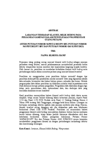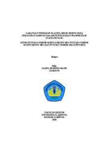 NAJWA , SILMISYA HANIF (2026) LARANGAN TERHADAP KLAUSUL MILIK BEDING PADA PERJANJIAN JAMINAN DALAM PENYELESAIAN WANPRESTASI UTANG PIUTANG (STUDI PUTUSAN NOMOR 56/PDT.G/2022/PN SBY, PUTUSAN NOMOR 563/PDT/2022/PT SBY DAN PUTUSAN NOMOR 4263 K/PDT/2023). FAKULTAS HUKUM , UNIVERSITAS LAMPUNG.