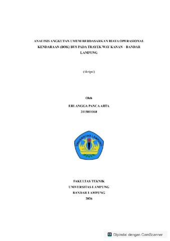 Erlangga, Panca Arta (2026) ANALISIS ANGKUTAN UMUM BERDASARKAN BIAYA OPERASIONAL KENDARAAN (BOK) BUS PADA TRAYEK WAY KANAN - BANDAR LAMPUNG. FAKULTAS TEKNIK, UNIVERSITAS LAMPUNG.