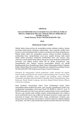 MUHAMMAD , FAKHRI LUTHFI (2026) DASAR PERTIMBANGAN HAKIM DALAM MENJATUHKAN PIDANA TERHADAP PELAKU TINDAK PIDANA PERCOBAAN PEMBUNUHAN (Studi Putusan Nomor 963/Pid.B/2024/PN Tjk). FAKULTAS HUKUM, UNIVERSITAS LAMPUNG.