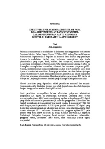 ANI , ANGGRAINI (2026) EFEKTIVITAS PELAYANAN ADMINISTRASI PADA DINAS KEPENDUDUKAN DAN CATATAN SIPIL DALAM PENGURUSAN KARTU KELUARGA DIGITAL DI KABUPATEN LAMPUNG BARAT. FAKULTAS HUKUM, UNIVERSITAS LAMPUNG.
