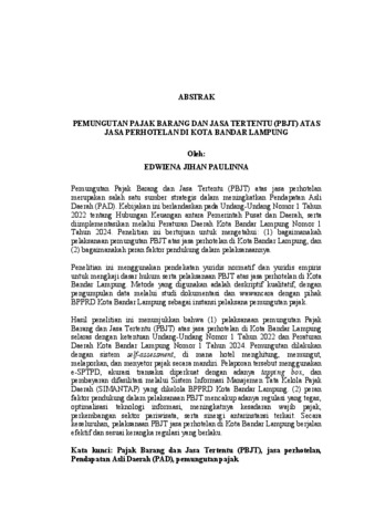 EDWIENA , JIHAN PAULINNA (2026) PEMUNGUTAN PAJAK BARANG DAN JASA TERTENTU (PBJT) ATAS JASA PERHOTELAN DI KOTA BANDAR LAMPUNG. FAKULTAS HUKUM, UNIVERSITAS LAMPUNG.