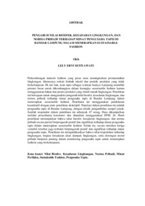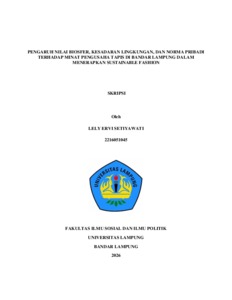 ERVI SETIYAWATI, LELY (2026) PENGARUH NILAI BIOSFER, KESADARAN LINGKUNGAN, DAN NORMA PRIBADI TERHADAP MINAT PENGUSAHA TAPIS DI BANDAR LAMPUNG DALAM MENERAPKAN SUSTAINABLE FASHION. FAKULTAS ILMU SOSIAL DAN ILMU POLITIK, UNIVERSITAS LAMPUNG.