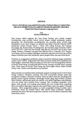 ELIZA , ENDITHA.P (2025) UPAYA NON PENAL DALAM PENCEGAHAN TINDAK PIDANA NARKOTIKA MELALUI PEMBENTUKAN KAMPUNG BERSINAR (BERSIH NARKOBA) (Studi Pada Polres Kotabumi, Lampung Utara). FAKULTAS HUKUM , UNIVERSITAS LAMPUNG.