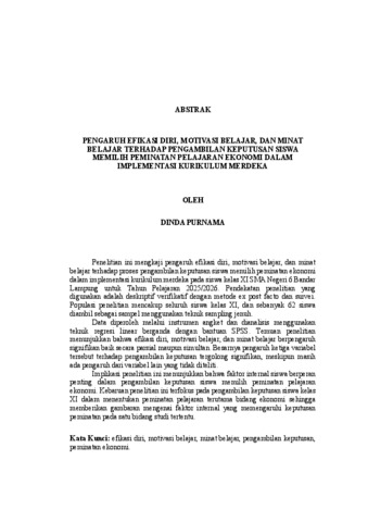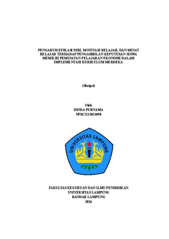 DINDA , PURNAMA (2026) PENGARUH EFIKASI DIRI, MOTIVASI BELAJAR, DAN MINAT BELAJAR TERHADAP PENGAMBILAN KEPUTUSAN SISWA MEMILIH PEMINATAN PELAJARAN EKONOMI DALAM IMPLEMENTASI KURIKULUM MERDEKA. FAKULTAS KEGURUAN DAN ILMU PENDIDIKAN, UNIVERSITAS LAMPUNG.