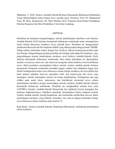 ABSTRAK Penelitian ini bertujuan mengembangkan metode pembelajaran membaca awal Struktur Analitik-Sintetik (SAS) berbasis humanistik berbantuan multimedia untuk meningkatkan minat belajar khususnya membaca siswa sekolah dasar. Penelitian ini menggunakan pendekatan Research and Development (R&D) yang diintegrasikan dengan model ADDIE. Tahap analisis kebutuhan selaras dengan fase Analysis, diikuti perancangan produk pada fase Design. Pengembangan produk penelitian ini terdapat pada tahap Development, yaitu pengembangan metode pembelajaran membaca awal Struktur Analitik-Sintetik (SAS) berbasis humanistik berbantuan multimedia. Data dalam penelitiam ini dikumpulkan melalui wawancara, observasi, dan observasi mengenai minat membaca serta keterlibatan siswa. Hasil penelitian menunjukkan bahwa metode struktur analitik-sintetik berbasis humanistik berbantuan multimedia memiliki tingkat validitas dan reliabilitas tinggi serta efektif meningkatkan minat siswa khususnya dalam belajar membaca, hal ini terbukti dari hasil analisis terhadap motivasi, partisipasi aktif, dan kepercayaan diri siswa yang meningkat seteleh menerapkan metode ini dalam pembelajaran. Peningkatan lain juga terlihat pada aspek fokus, antusiasme, dan keterlibatan emosional siswa selama pembelajaran membaca dengan menersapkan metode struuktur analitik-sintetik berbasis humanistik berbantuan multimedia. Penelitian ini menghasilkan metode baru yaitu SANTIKA (Struktur Analitik-Sintetik Humanistik dan Aplikatif) beserta perangkat dan panduan implementasinya. Implikasi penelitian menunjukkan bahwa integrasi metode struktur analitik-sintetik, prinsip humanistik, dan multimedia memberikan inovasi dalam pembelajaran membaca yang holistik, bermakna, dan relevan dengan kebutuhan belajar siswa khususnya dalam membaca pada abad ke-21. Kata Kunci : Struktur Analitik-Sintetik, Pendekatan Humanistik, multimedia pembelajaran minat membaca.