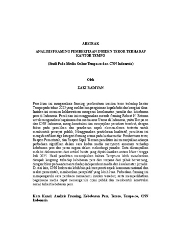 Penelitian ini menganalisis framing pemberitaan insiden teror terhadap kantor Tempo pada tahun 2025 yang melibatkan pengiriman kepala babi dan bangkai tikus. Insiden ini memicu kekhawatiran mengenai keselamatan jurnalis dan kebebasan pers di Indonesia. Penelitian ini menggunakan metode framing Robert N. Entman untuk menganalisis bagaimana dua media arus Utama di Indonesia, yaitu Tempo.co dan CNN Indonesia, meng-konstruksi dan menyajikan peristiwa tersebut, dengan fokus pada pemilihan dan penekanan aspek elemen-elmen tertentu untuk membentuk persepsi publik, Menggunakan pendekatan kualitatif, penelitian ini mengidentifikasi tiga kategori framing utama pada kedua media: Pemberitaan teror, Respon Pemerintah, dan Respon Sipil. Temuan penelitian ini menunjukkan adanya perbedaan signifikan dalam cara kedua media menyoroti ancaman terhadap kebebasan pers dan peran negara dalam melindungi jurnalis. Data dikumpulkan melalui dokumentasi dari artikel berita yang dipublikasikan antara Maret hingga Juli 2025. Hasil penelitian menunjukkan bahwa Tempo.co lebih menekankan dampak langsung terhadap kebebasan pers dan respons dari pihak berwenang, dengan fokus pada ancaman terhadap independensi media dan keselamatan jurnalis. Di sisi lain, CNN Indonesia lebih banyak menyoroti aspek keamanan nasional dan reaksi pemerintah, memberikan perspektif yang lebih luas. Perbedaan framing ini mempengaruhi cara pembaca memahami insiden tersebut, serta memperlihatkan bagaimana media dapat memengaruhi opini publik dan membentuk konstruksi sosial terkait kebebasan pers. Kata Kunci: Analisis Framing, Kebebasan Pers, Teroro, Tempo.co, CNN Indonesia This study analyzes the framing of news reports on the terrorist incident against the Tempo office in 2025, which involved the delivery of a pig's head and rat carcasses. This incident sparked concerns about the safety of journalists and freedom of the press in Indonesia. This study uses Robert N. Entman's framing method Entman's framing method to analyze how two mainstream media outlets in Indonesia, Tempo.co and CNN Indonesia, constructed and presented the event, focusing on the selection and emphasis of certain elements to shape public perception. Using a qualitative approach, this study identified three main framing categories in both media outlets: Terrorist reporting, Government response, and Civil response. The findings of this study show significant differences in the way the two media outlets highlight threats to press freedom and the role of the state in protecting journalists. Data was collected through documentation of news articles published between March and July 2025. The results show that Tempo.co places more emphasis on the direct impact on press freedom and the response from the authorities, focusing on threats to media independence and the safety of journalists. On the other hand, CNN Indonesia highlighted aspects of national security and the government's reaction, providing a broader perspective. These differences in framing influenced how readers understood the incident and showed how the media can influence public opinion and shape social constructs related to press freedom. Keywords: Framing Analysis, Freedom of the Press, Terror, Tempo.co, CNN Indonesia