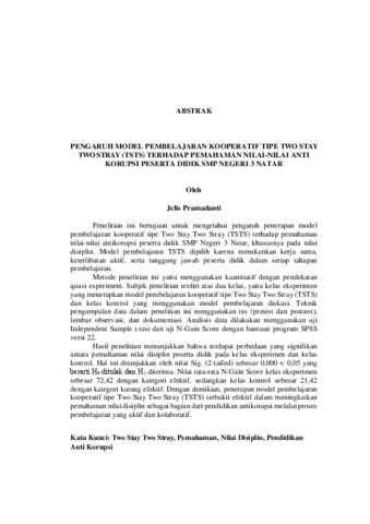 PENGARUH MODEL PEMBELAJARAN KOOPERATIF TIPE TWO STAY TWO STRAY (TSTS) TERHADAP PEMAHAMAN NILAI-NILAI ANTI KORUPSI PESERTA DIDIK SMP NEGERI 3 NATAR
