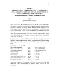 Pabrik Vinil Asetat (C4H6O2) berbahan baku Etilen (C2H4), Asam Asetat (C2H4O2), dan Oksigen (O2) dengan proses oksidasi menggunakan katalis Paladium (Pd/Au), direncanakan didirikan di Cilegon, Banten. Pendirian parbrik berdasarkan atas pertimbangan ketersedian bahan baku, sarana transportasi yang memadai, kebutuhan utilitas yang mencukupi, tenaga kerja yang mudah didapatkan dan kondisi lingkungan. Pabrik direncanakan memproduksi Vinil Asetat sebanyak 36.000 ton/tahun, dengan waktu operasi 24 jam/hari, 330 hari/tahun. Bahan baku yang digunakan berupa Etilen, Asam Asetat, dan Oksigen. Penyediaan kebutuhan utilitas pabrik Vinil Asetat terdiri dari unit pengadaan air, udara, instrument, steam, listrik dan limbah. Bentuk perusahaan adalah Perseroan Terbatas (PT) menggunakan struktur organisasi line dan staff dengan jumlah karyawan 136 orang. Dari analisis ekonomi diperoleh: Fixed Capital Investment (FCI) = Rp. 957.440.514.510 Working Capital Investment (WCI) = Rp. 168.960.090.796 Total Capital Investment (TCI) = Rp. 1.126.400.605.306 Break Even Point (BEP) = 45,34% Shut Down Point (SDP) = 20,91% Pay Out Time (POT)a = 3,3 tahun Return on Investment before taxes (ROI)b = 22,67% Return on Investment after taxes (ROI)a = 21,57% Discounted Cash Flow (DCF) = 25,02% Berdasarkan ringkasan di atas, pendirian Pabrik Vinil Asetat ini layak untuk dikaji lebih lanjut, karena menguntungkan dan memiliki prospek yang baik di masa mendatang. Kata kunci : Vinil Asetat, Etilen, Asam Asetat, Proses oksidasi, Katalis Pd/Au