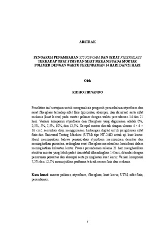 PENGARUH PENAMBAHAN STYROFOAM DAN SERAT FIBERGLASS TERHADAP SIFAT FISIS DAN SIFAT MEKANIS PADA MORTAR POLIMER DENGAN WAKTU PERENDAMAN 14 HARI DAN 21 HARI