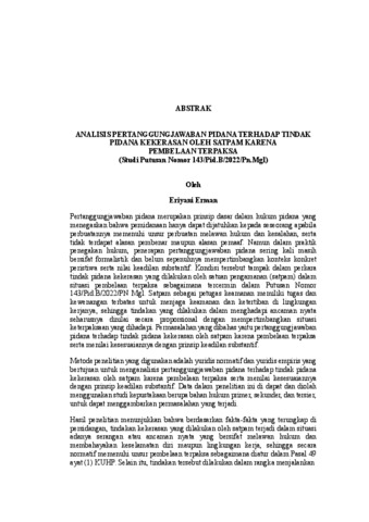 Eriyani , Erman (2026) ANALISIS PERTANGGUNGJAWABAN PIDANA TERHADAP TINDAK PIDANA KEKERASAN OLEH SATPAM KARENA PEMBELAAN TERPAKSA (Studi Putusan Nomor 143/Pid.B/2022/Pn.Mgl). FAKULTAS HUKUM , UNIVERSITAS LAMPUNG.