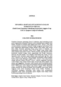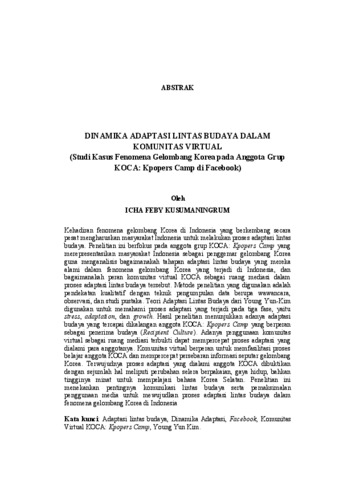 Kehadiran fenomena gelombang Korea di Indonesia yang berkembang secara pesat mengharuskan masyarakat Indonesia untuk melakukan proses adaptasi lintas budaya. Penelitian ini berfokus pada anggota grup KOCA: Kpopers Camp yang merepresentasikan masyarakat Indonesia sebagai penggemar gelombang Korea guna menganalisis bagaimanakah tahapan adaptasi lintas budaya yang mereka alami dalam fenomena gelombang Korea yang terjadi di Indonesia, dan bagaimanakah peran komunitas virtual KOCA sebagai ruang mediasi dalam proses adaptasi lintas budaya tersebut. Metode penelitian yang digunakan adalah pendekatan kualitatif dengan teknik pengumpulan data berupa wawancara, observasi, dan studi pustaka. Teori Adaptasi Lintas Budaya dari Young Yun-Kim digunakan untuk memahami proses adaptasi yang terjadi pada tiga fase, yaitu stress, adaptation, dan growth. Hasil penelitian menunjukkan adanya adaptasi budaya yang tercapai dikalangan anggota KOCA: Kpopers Camp yang berperan sebagai penerima budaya (Recipient Culture). Adanya penggunaan komunitas virtual sebagai ruang mediasi terbukti dapat mempercepat proses adaptasi yang dialami para anggotanya. Komunitas virtual berperan untuk memfasilitasi proses belajar anggota KOCA dan mempercepat persebaran informasi seputar gelombang Korea. Terwujudnya proses adaptasi yang dialami anggota KOCA dibuktikan dengan sejumlah hal meliputi perubahan selera berpakaian, gaya hidup, bahkan tingginya minat untuk mempelajari bahasa Korea Selatan. Penelitian ini menekankan pentingnya komunikasi lintas budaya serta pemaksimalan penggunaan media untuk mewujudkan proses adaptasi lintas budaya dalam fenomena gelombang Korea di Indonesia Kata kunci: Adaptasi lintas budaya, Dinamika Adaptasi, Facebook, Komunitas Virtual KOCA: Kpopers Camp, Young Yun Kim.