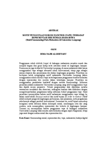 BIMA, NAJIB ALGHIFFARY (2025) MOTIF PENGGUNAAN ROKOK ELEKTRIK (VAPE) TERHADAP REPRESENTASI DIRI REMAJA MAHASISWA (Studi Fenomenologi Pada Mahasiswa di Universitas Lampung). FAKULTAS ILMU SOSIAL DAN ILMU POLITIK , UNIVERSITAS LAMPUNG.