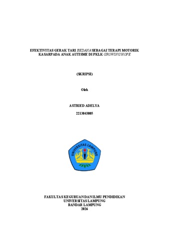 ASTRIED , ADELYA (2026) EFEKTIVITAS GERAK TARI BEDANA SEBAGAI TERAPI MOTORIK KASAR PADA ANAK AUTISME DI PKLK GROWING HOPE. FAKULTAS KEGURUAN DAN ILMU PENDIDIKAN, UNIVERSITAS LAMPUNG.