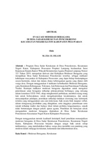 Abstrak : Program Desa Sadar Kerukunan di Desa Poncokresno, Kecamatan Negeri Katon, Kabupaten Pesawaran Propinsi Lampung berdasarkan Surat Keputusan Kepala Kantor Wilayah Kementerian Agama Propinsi Lampung Nomor 321 Tahun 2019, merupakan derivasi dari Kebijakan Moderasi Beragama yang menjadikan Desa Sadar Kerukunan Poncokresno tersebut, sebagai indikator kehidupan masyarakat di Kabupaten Pesawaran yang dapat hidup berdampingan secara harmonis, rukun dan damai, diatas keberagaman agama yang dianut oleh warga desa. Dengan menggunakan 4 indikator keberhasilan Moderasi Beragama, yaitu Komitmen Kebangsaan, Toleransi, Anti Kekerasan dan Penerimaan Terhadap Tradisi. Keempat indikator moderasi beragama digunakan untuk mengukur penerimaan umat beragama terhadap prinsip-prinsip berbangsa yang tertuang dalam konstitusi UUD 1945, sikap menghormati perbedaan, memberi ruang orang lain untuk berkeyakinan, untuk mengekspresikan keyakinannya, dan untuk menyampaikan pendapat, penolakan terhadap tindakan seseorang atau kelompok tertentu yang menggunakan cara-cara kekerasan, baik secara fisik maupun verbal, dalam mengusung perubahan yang diinginkan, serta tingginya penerimaan serta ramah terhadap tradisi dan budaya lokal dalam perilaku keagamaannya, sejauh tidak bertentangan dengan pokok ajaran agama. Penelitian ini bertujuan untuk menganalisis moderasi beragama dijalankan di Desa Sadar Kerukunan Poncokresno Kecamatan Negeri Katon Kabupaten Pesawaran, Dengan menggunakan metode kualitatif deskriptif, hasil penelitian menunjukkan moderasi beragama di Desa Sadar Kerukunan Poncokresno, Kecamatan Negeri Katon, Kabupaten Pesawaran berjalan dengan sangat baik untuk setiap indikatornya, yang membuktikan bahwa warga desa memiliki cara pandang yang moderat dalam menjaga kerukunan, kedamaian dan keharmonisan desa. Kata Kunci : Moderasi Beragama, Kerukunan