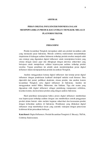 Produk kecantikan Tiongkok merupakan salah satu produk kecantikan unik yang memasuki pasar Indonesia. Metode celebrity endorsement menumbuhkan skeptisisme di kalangan audiens Indonesia terhadap produk tersebut menjadi salah satu strategi yang digunakan digital influencer untuk menciptakan konten yang selaras dengan narasi jujur dan dilengkapi dengan aktivitas sehari-hari yang bertujuan untuk memperkuat validasi kepercayaan audiens terhadap produk tersebut. Tujuan penelitian ini adalah untuk mendeskripsikan peran digital influencer dalam mempopulerkan produk kecantikan Tiongkok. Analisis menggunakan konsep digital influencer dan konsep peran digital influencer dengan pendekatan kualitatif deskriptif melalui studi literatur. Data diperoleh dari jurnal, publikasi akademis, ulasan produk, dan analisis konten kecantikan Tiongkok serta digital influencer di Indonesia. Analisis ini menggunakan model Miles, Huberman, dan Saldana. Tiga alat utama yang digunakan oleh digital influencer sebagai pendukung transparansi selebritas, keaslian konten, dan keselaran produk asing dengan audiens Indonesia. Hasil penelitian menunjukan bahwa proses digital influencer memberikan rasa kepercayaan terhadap audiens dengan cara memberikan contoh penggunaan produk dalam bentuk video melalui kegiatan sehari-hari dan kesesuaian produk dengan kebutuhan audiens di Indonesia. Pendekatan yang dilakukan digital influencer tetap memberikan kesan yang autentik walaupun dengan penawaran kolaborasi iklan perusahaan berbayar. Kata Kunci: Digital Influencer, Produk Kecantikan Tiongkok (C-Beauty), TikTok, Celebrity Endorsement.
