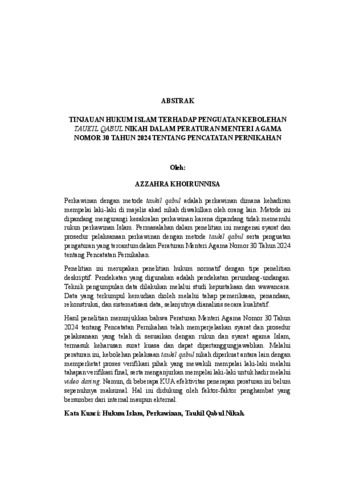 Perkawinan dengan metode taukil qabul adalah perkawinan dimana kehadiran mempelai laki-laki di majelis akad nikah diwakilkan oleh orang lain. Metode ini dipandang mengurangi kesakralan perkawinan karena dipandang tidak memenuhi rukun perkawinan Islam. Permasalahan dalam penelitian ini mengenai syarat dan prosedur pelaksanaan perkawinan dengan metode taukil qabul serta penguatan pengaturan yang tercantum dalam Peraturan Menteri Agama Nomor 30 Tahun 2024 tentang Pencatatan Pernikahan. Penelitian ini merupakan penelitian hukum normatif dengan tipe penelitian deskriptif. Pendekatan yang digunakan adalah pendekatan perundang-undangan. Teknik pengumpulan data dilakukan melalui studi kepustakaan dan wawancara. Data yang terkumpul kemudian dioleh melalui tahap pemeriksaan, penandaan, rekonstruksi, dan sistematisasi data, selanjutnya dianalisis secara kualitatif. Hasil penelitian menunjukkan bahwa Peraturan Menteri Agama Nomor 30 Tahun 2024 tentang Pencatatan Pernikahan telah memperjelaskan syarat dan prosedur pelaksanaan yang telah di sesuaikan dengan rukun dan syarat agama Islam, termasuk keharusan surat kuasa dan dapat dipertanggungjawabkan. Melalui peraturan ini, kebolehan pelaksaan taukil qabul nikah diperkuat antara lain dengan memperketat proses verifikasi pihak yang mewakili mempelai laki-laki melalui tahapan verifikasi final, serta menganjurkan mempelai laki-laki untuk hadir melalui video daring. Namun, di beberapa KUA efektivitas penerapan peraturan ini belum sepenuhnya maksimal. Hal ini didukung oleh faktor-faktor penghambat yang bersumber dari internal maupun ekternal. Kata Kunci: Hukum Islam, Perkawinan, Taukil Qabul Nikah.