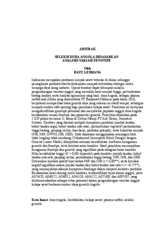 Indonesia merupakan produsen minyak sawit terbesar di dunia, sehingga peningkatan produktivitas berkelanjutan menjadi kebutuhan strategis untuk menjaga daya saing industri. Upaya tersebut dapat ditempuh melalui pengembangan varietas unggul yang memiliki hasil minyak tinggi, pertumbuhan batang lambat, serta kualitas agronomis yang baik. dura Angola, sebagai plasma nutfah asal Afrika yang diintroduksi PT Binasawit Makmur pada tahun 2010, berpotensi memperluas basis genetik dura yang selama ini relatif sempit, sekaligus menjadi sumber sifat penting bagi pemuliaan kelapa sawit. Penelitian ini bertujuan mengidentifikasi genotipe potensial dan menyeleksi populasi unggul dura Angola berdasarkan variasi fenotipe dan parameter genetik. Penelitian dilakukan pada 1.029 pohon berumur 11 tahun di Kebun Mesuji PT Aek Tarum, Sumatera Selatan. Karakter yang diamati meliputi komponen produksi (jumlah tandan, bobot tandan segar, bobot tandan rata-rata), pertumbuhan vegetatif (pertambahan tinggi batang, panjang rachis, luas daun, produksi pelepah), serta kuantitas minyak (F/B, M/F, O/WM, O/B, OER). Data dianalisis menggunakan rancangan blok tidak lengkap tidak seimbang (Unbalanced Incomplete Block Design) dengan General Linear Model, dilanjutkan estimasi heritabilitas, koefisien keragaman genetik dan fenotipe, serta korelasi antar karakter. Hasil penelitian menunjukkan keragaman fenotipe dan genetik yang signifikan pada sebagian besar karakter. Nilai heritabilitas tinggi (h² > 0,60) diperoleh pada karakter jumlah tandan, bobot tandan rata-rata, panjang rachis, pertambahan tinggi batang, M/F, O/B, dan OER. Ditemukan korelasi positif kuat antara M/F dan O/B (r = 0,80**), serta korelasi negatif signifikan antara jumlah tandan dan bobot tandan rata-rata (r = –0,75**), yang menunjukkan adanya kompromi fisiologis dalam ekspresi karakter produksi. Berdasarkan hasil skoring multi-karakter, teridentifikasi tujuh aksesi unggul, yaitu A074/20, A040/22, A040/12, A041/26, A041/22, A075/08, dan A095/05, yang direkomendasikan sebagai tetua potensial dalam pengembangan varietas unggul kelapa sawit berbasis sumber daya genetik Angola. Kata kunci: dura Angola, heritabilitas, kelapa sawit, plasma nutfah, seleksi genetik.