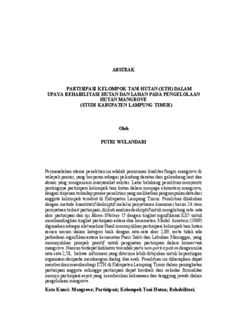 Putri, Wulandari (2025) PARTISIPASI KELOMPOK TANI HUTAN (KTH) DALAM UPAYA REHABILITASI HUTAN DAN LAHAN PADA PENGELOLAAN HUTAN MANGROVE (STUDI KABUPATEN LAMPUNG TIMUR). FAKULTAS ILMU SOSIAL DAN ILMU POLITIK, UNIVERSITAS LAMPUNG.