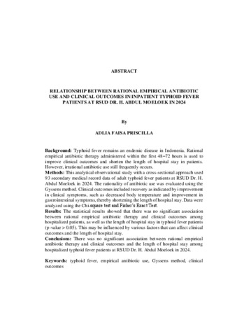 Adlia Faisa, Priscilla (2026) HUBUNGAN PENGGUNAAN ANTIBIOTIK EMPIRIS RASIONAL DENGAN CLINICAL OUTCOMES PADA PASIEN RAWAT INAP DEMAM TIFOID DI RSUD DR. H. ABDUL MOELOEK TAHUN 2024. FAKULTAS KEDOKTERAN, UNIVERSITAS LAMPUNG.