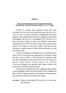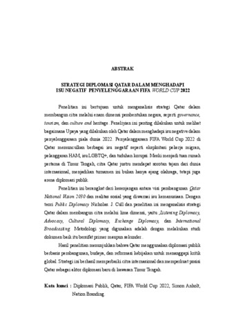 Penelitian ini bertujuan untuk menganalisis strategi Qatar dalam membangun citra melalui enam dimensi pembentukan negara, seperti governance, tourism, dan culture and heritage. Peneliyian ini penting dilakukan untuk melihat bagaimana Upaya yang dilakukan oleh Qatar dalam menghadapi isu negative dalam penyelenggaraan piala dunia 2022. Penyelenggaraan FIFA World Cup 2022 di Qatar memunculkan berbagai isu negatif seperti eksploitasi pekerja migran, pelanggaran HAM, isu LGBTQ+, dan tuduhan korupsi. Meski menjadi tuan rumah pertama di Timur Tengah, citra Qatar justru mendapat sorotan tajam dari dunia internasional, menjadikan turnamen ini bukan hanya ajang olahraga, tetapi juga arena diplomasi publik. Penelitian ini berangkat dari kesenjangan antara visi pembangunan Qatar National Vision 2030 dan realitas sosial yang diwarnai isu kemanusiaan. Dengan teori Public Diplomacy Nicholas. J. Cull dan penelitian ini menganalisis strategi Qatar dalam membangun citra melalui lima dimensi, yaitu ;Listening Diplomacy, Advocacy, Cultural Diplomacy, Exchange Diplomacy, dan International Broadcasting. Metodologi yang digunakan adalah dengan melakukan studi dokumen baik itu bersifat primer maupun sekunder.. Hasil penelitian menunjukkan bahwa Qatar menggunakan diplomasi publik berbasis pembangunan, budaya, dan reformasi kebijakan untuk menanggapi kritik global. Strategi ini berhasil memperbaiki citra internasional dan memperkuat posisi Qatar sebagai aktor diplomasi baru di kawasan Timur Tengah. Kata kunci : Diplomasi Publik, Qatar, FIFA World Cup 2022, Simon Anholt, Nation Branding.