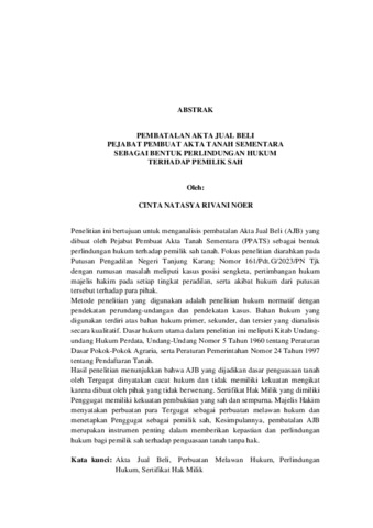 CINTA , NATASYA RIVANI NOER (2026) PEMBATALAN AKTA JUAL BELI PEJABAT PEMBUAT AKTA TANAH SEMENTARA SEBAGAI BENTUK PERLINDUNGAN HUKUM TERHADAP PEMILIK SAH. FAKULTAS HUKUM, UNIVERSITAS LAMPUNG.