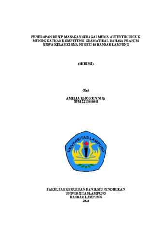 AMELIA KHOIRUN, NISA (2026) Penerapan resep masakan sebagai media autentik: Upaya meningkatkan kompetensi gramatikal bahasa Prancis siswa kelas XI SMA Negeri 16 Bandar Lampung. FAKULTAS KEGURUAN DAN ILMU PENDIDIKAN, UNIVERSITAS LAMPUNG.