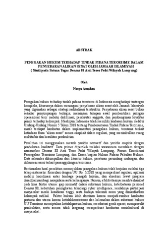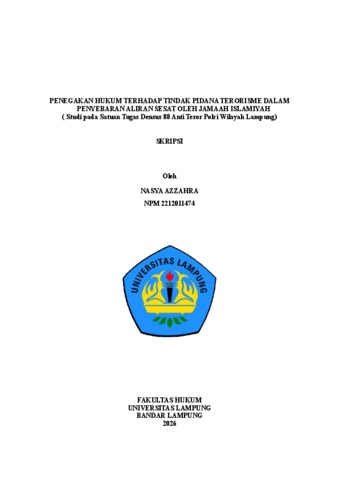 Nasya, Azzahra (2026) PENEGAKAN HUKUM TERHADAP TINDAK PIDANA TERORISME DALAM PENYEBARAN ALIRAN SESAT OLEH JAMAAH ISLAMIYAH ( Studi pada Satuan Tugas Densus 88 Anti Teror Polri Wilayah Lampung). FAKULTAS HUKUM, UNIVERSITAS LAMPUNG.