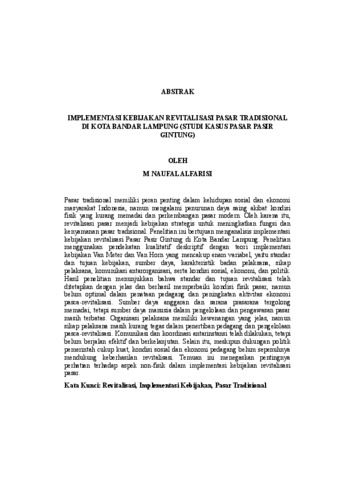 M NAUFAL, ALFARISI (2026) IMPLEMENTASI KEBIJAKAN REVITALISASI PASAR TRADISIONAL DI KOTA BANDAR LAMPUNG (STUDI KASUS PASAR PASIR GINTUNG). FAKULTAS ILMU SOSIAL DAN ILMU POLITIK, UNIVERSITAS LAMPUNG.
