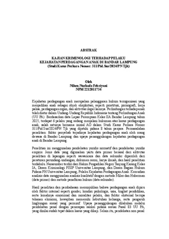 NIKEN , NURHADZ FEBRIYANI (2026) KAJIAN KRIMINOLOGI TERHADAP PELAKU KEJAHATAN PERDAGANGAN ANAK DI BANDAR LAMPUNG (Studi Kasus Perkara Nomor: 311/Pid.Sus/2024/PN Tjk). FAKULTAS HUKUM, UNIVERSITAS LAMPUNG.