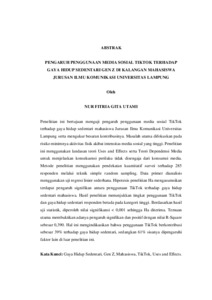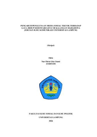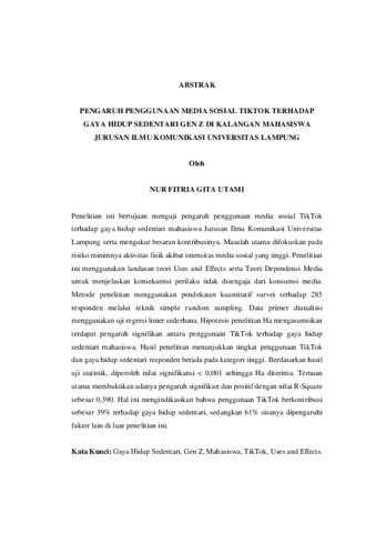 Nur Fitria , Gita Utami (2026) PENGARUH PENGGUNAAN MEDIA SOSIAL TIKTOK TERHADAP GAYA HIDUP SEDENTARI GEN Z DI KALANGAN MAHASISWA JURUSAN ILMU KOMUNIKASI UNIVERSITAS LAMPUNG. FAKULTAS ILMU SOSIAL DAN ILMU POLITIK, UNIVERSITAS LAMPUNG.