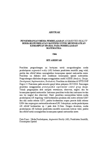 Penelitian pengembangan ini bertujuan untuk mengembangkan media pembelajaran augmented reality (AR) berbasis pendekatan saintifik yang valid, praktis dan efektif dalam meningkatkan kemampuan spasial matematika siswa. Penelitian ini didasari oleh rendahnya kemampuan spasial matematika. Pengembangan dilakukan dengan menggunakan model ADDIE (Analysis, Design, Development, Implementation, Evaluation). Penelitian ini dilakukan di UPTD SMP Negeri 11 Pesawaran pada semester ganjil tahun pelajaran 2025/2026. Rancangan penelitian menggunakan pretest-posttest experimental control group design. Teknik pengumpulan data meliputi wawancara, observasi, angket, dan tes kemampuan spasial matematika. Instrumen penelitian terdiri dari instrumen tes dan non tes (angket dan observasi). Hasil penelitian menunjukkan bahwa media pembelajaran AR tergolong valid berdasarkan penilaian ahli materi sebesar 0,867 dan ahli media sebesar 0,875, praktis berdasarkan respon peserta didik sebesar 0,904 dan respon guru matematika sebesara 0,90. Selanjutnya, media pembelajaran AR efektif berdasarkan uji t pada data N-Gain. Dengan demikian, media pembelajaran AR berbasis pendekatan saintifik memenuhi kriteria valid, praktis dan efektif untuk meningkatkan kemampuan spasial matematika siswa.