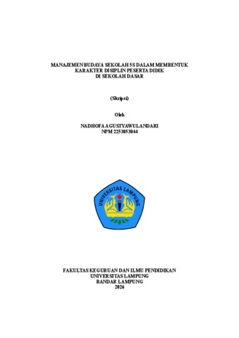 NADHOFA , AGUSTYAWULANDARI (2026) MANAJEMEN BUDAYA SEKOLAH 5S DALAM MEMBENTUK KARAKTER DISIPLIN PESERTA DIDIK DI SEKOLAH DASAR. FAKULTAS KEGURUAN DAN ILMU PENDIDIKAN, UNIVERSITAS LAMPUNG.