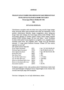 Sikloheksanon merupakan salah satu bahan kimia yang memiliki fungsi sebagai bahan intermediet dalam proses pembuatan asam adipic dan kaprolaktam. Proses produksi sikloheksanon dilakukan dengan menggunakan proses hidrogenasi dengan bahan baku hidrogen dan fenol dengan bantuan katalis Pd/MgO. Pabrik direncanakan dibangun di Kawasan Industri Cilegon, Banten dengan kapasitas produksi 60.000 ton/tahun dengan 330 hari kerja dalam 1 tahun. Penyediaan keutuhan utilitas pabrik berupa pengadaan air, pengadaan steam, pengadaan listrik, kebutuhan bahan bakar, dan pengadaan udara. Tenaga kerja ang dibutuhkan sebanyak 175 orang, pabrik berbentuk Perseroan Terbatas (PT) dan struktur organisasi line and staff. Dari analisis ekonomi diperoleh: Fixed Capital Investment (FCI) = Rp 2.710.740.749.639,450 Working Capital Investment (WCI) = Rp 478.366.014.642,256 Total Capital Investment (TCI) = Rp 3.189.106.764.281,700 Break Even Point (BEP) = 46% Shut Down Point (SDP) = 30% Pay Out Time before taxes (POT)b = 1,75 tahun Pay Out Time after taxes (POT)a = 2,09 tahun Return on Investment before taxes (ROI)b = 40% Return on Investment after taxes (ROI)a = 32% Discounted cash flow (DCF) = 39,53% Berdasarkan paparan di atas, maka pendirian pabrik Sikloheksanon dinilai layak untuk dipertimbangkan kedepannya karena menguntungkan secara ekonomi dan memiliki masa depan yang relatif menjanjikan. Kata kunci: hidrogenasi, line and staff, sikloheksanon, utilitas Cyclohexanone is one of the chemicals that has a function as an intermediate ingredient in the process of making adipic and caprolactam acids. The production process of cyclohexanone is carried out using a hydrogenation process with hydrogen and phenol raw materials with the help of Pd/MgO catalysts. The factory is planned to be built in the Cilegon Industrial Estate, Banten with a production capacity of 60,000 tons/year with 330 working days in 1 year. The provision of factory utilities is in the form of water procurement, steam procurement, electricity procurement, fuel needs, and air procurement. The workforce is needed as many as 175 people, the factory is in the form of a Limited Liability Company (PT) and the organizational structure of line and staff. From the economic analysis it is obtained: Fixed Capital Investment (FCI) = Rp 2.710.740.749.639,450 Working Capital Investment (WCI) = Rp 478.366.014.642,256 Total Capital Investment (TCI) = Rp 3,189,106,764,281,700 Break Even Point (BEP) = 46% Shut Down Point (SDP) = 30% Pay Out Time before taxes (POT)b = 1,75 tahun Pay Out Time after taxes (POT)a = 2,09 tahun Return on Investment before taxes (ROI)b = 40% Return on Investment after taxes (ROI)a = 32% Discounted cash flow (DCF) = 39,53% Based on the above explanation, the establishment of the Cyclohexanon factory is considered worthy of consideration in the future because it is economically profitable and has a relatively promising future. Keywords: hydrogenation, line and staff, cyclohexanene, utility