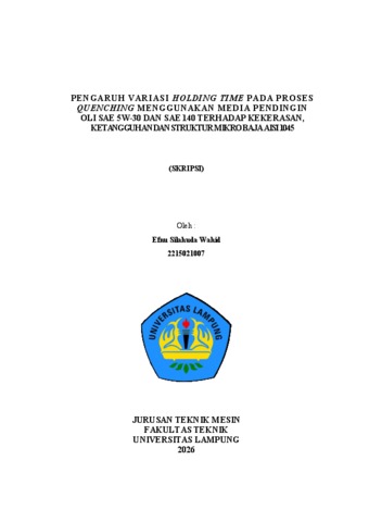 Efnu , Silahuda Wahid (2026) PENGARUH VARIASI HOLDING TIME PADA PROSES QUENCHING MENGGUNAKAN MEDIA PENDINGIN OLI SAE 5W-30 DAN SAE 140 TERHADAP KEKERASAN, KETANGGUHAN DAN STRUKTUR MIKRO BAJA AISI 1045. FAKULTAS TEKNIK, UNIVERSITAS LAMPUNG.