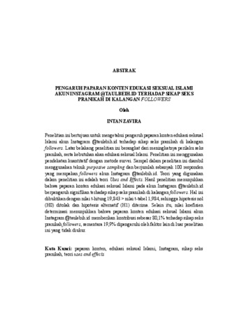 Penelitian ini bertujuan untuk mengetahui pengaruh paparan konten edukasi seksual Islami akun Instagram @taulebih.id terhadap sikap seks pranikah di kalangan followers. Latar belakang penelitian ini berangkat dari meningkatnya perilaku seks pranikah, serta kebutuhan akan edukasi seksual Islami. Penelitian ini menggunakan pendekatan kuantitatif dengan metode survei. Sampel dalam penelitian ini diambil menggunakan teknik purposive sampling dan berjumlah sebanyak 100 responden yang merupakan followers akun Instagram @taulebih.id. Teori yang digunakan dalam penelitian ini adalah teori Uses and Effects. Hasil penelitian menunjukkan bahwa paparan konten edukasi seksual Islami pada akun Instagram @taulebih.id berpengaruh signifikan terhadap sikap seks pranikah di kalangan followers. Hal ini dibuktikan dengan nilai t-hitung 19,843 > nilai t-tabel 1,984, sehingga hipotesis nol (H0) ditolak dan hipotesis alternatif (H1) diterima. Selain itu, nilai koefisien determinasi menunjukkan bahwa paparan konten edukasi seksual Islami akun Instagram @taulebih.id memberikan kontribusi sebesar 80,1% terhadap sikap seks pranikah followers, sementara 19,9% dipengaruhi oleh faktor lain di luar penelitian ini yang tidak diukur. Kata Kunci: paparan konten, edukasi seksual Islami, Instagram, sikap seks pranikah, teori uses and effects