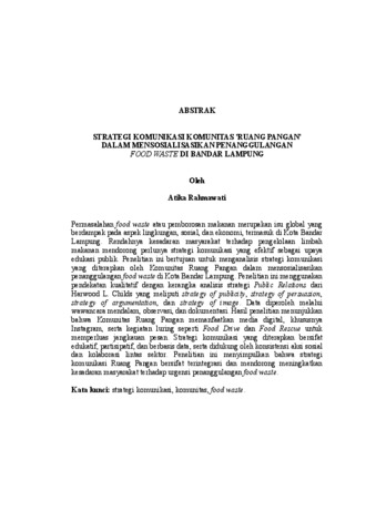 Permasalahan food waste atau pemborosan makanan merupakan isu global yang berdampak pada aspek lingkungan, sosial, dan ekonomi, termasuk di Kota Bandar Lampung. Rendahnya kesadaran masyarakat terhadap pengelolaan limbah makanan mendorong perlunya strategi komunikasi yang efektif sebagai upaya edukasi publik. Penelitian ini bertujuan untuk menganalisis strategi komunikasi yang diterapkan oleh Komunitas Ruang Pangan dalam mensosialisasikan penanggulangan food waste di Kota Bandar Lampung. Penelitian ini menggunakan pendekatan kualitatif dengan kerangka analisis strategi Public Relations dari Harwood L. Childs yang meliputi strategy of publicity, strategy of persuasion, strategy of argumentation, dan strategy of image. Data diperoleh melalui wawancara mendalam, observasi, dan dokumentasi. Hasil penelitian menunjukkan bahwa Komunitas Ruang Pangan memanfaatkan media digital, khususnya Instagram, serta kegiatan luring seperti Food Drive dan Food Rescue untuk memperluas jangkauan pesan. Strategi komunikasi yang diterapkan bersifat edukatif, partisipatif, dan berbasis data, serta didukung oleh konsistensi aksi sosial dan kolaborasi lintas sektor. Penelitian ini menyimpulkan bahwa strategi komunikasi Ruang Pangan bersifat terintegrasi dan mendorong meningkatkan kesadaran masyarakat terhadap urgensi penanggulangan food waste. Kata kunci: strategi komunikasi, komunitas, food waste. Food waste, or food loss, is a global issue that has significant environmental, social, and economic impacts, including in Bandar Lampung. The low level of public awareness regarding food waste management highlights the need for effective communication strategies as a form of public education. This study aims to analyze the communication strategies implemented by the Ruang Pangan Community in socializing food waste reduction efforts in Bandar Lampung. This research employs a qualitative approach using Harwood L. Childs’ Public Relations strategy framework as the analytical basis, which includes strategy of publicity, strategy of persuasion, strategy of argumentation, and strategy of image. Data were collected through in-depth interviews, observation, and documentation. The findings indicate that the Ruang Pangan Community utilizes digital media, particularly Instagram, along with offline activities such as Food Drive and Food Rescue to expand message outreach. The communication strategies applied are educational, participatory, and data-driven, supported by consistent social actions and crosssector collaboration. This study concludes that Ruang Pangan's communication strategy is integrated and fosters increased public awareness of the urgency of food waste mitigation. Keywords: communication strategy, community, food waste.