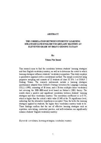 Nur Imani, Triana (2026) THE CORRELATION BETWEEN STUDENTS LEARNING STRATEGIES AND ENGLISH VOCABULARY MASTERY AT ELEVENTH GRADE OF SMAN 2 GEDONG TATAAN. FAKULTAS KEGURUAN DAN ILMU PENDIDIKAN, UNIVERSITAS LAMPUNG.