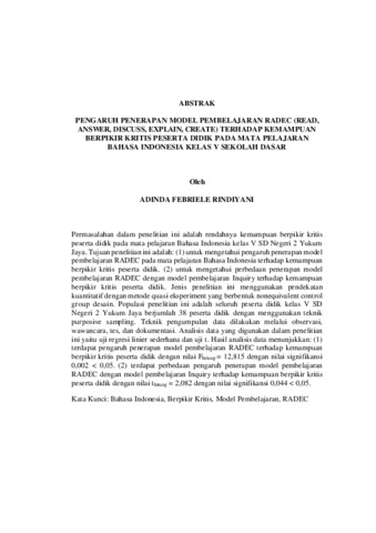 ADINDA, RINDIYANI (2026) PENGARUH PENERAPAN MODEL PEMBELAJARAN RADEC (READ, ANSWER, DISCUSS, EXPLAIN, CREATE) TERHADAP KEMAMPUAN BERPIKIR KRITIS PESERTA DIDIK PADA MATA PELAJARAN BAHASA INDONESIA KELAS V SEKOLAH DASAR. FAKULTAS KEGURUAN DAN ILMU PENDIDIKAN, UNIVERSITAS LAMPUNG.
