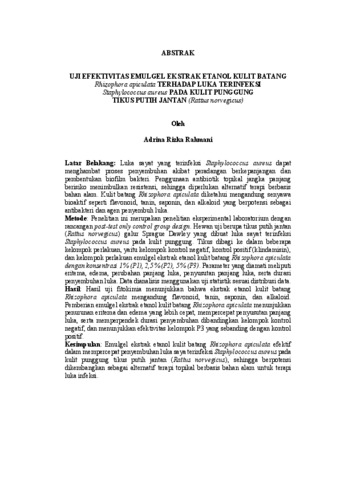 ADRINA RIZKA, RAHMANI (2026) UJI EFEKTIVITAS EMULGEL EKSTRAK ETANOL KULIT BATANG Rhizophora apiculata TERHADAP LUKA TERINFEKSI Staphylococcus aureus PADA KULIT PUNGGUNG TIKUS PUTIH JANTAN (Rattus norvegicus) GALUR Sprague Dawley. FAKULTAS KEDOKTERAN, UNIVERSITAS LAMPUNG.