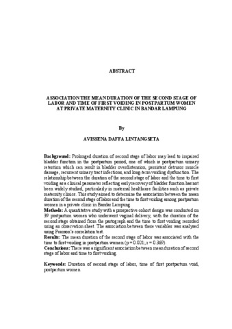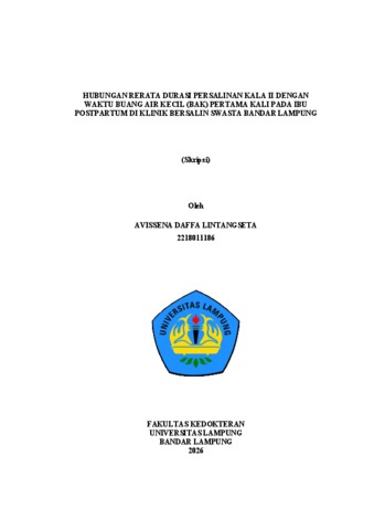 Avissena Daffa , Lintangseta (2026) HUBUNGAN RERATA DURASI PERSALINAN KALA II DENGAN WAKTU BUANG AIR KECIL (BAK) PERTAMA KALI PADA IBU POSTPARTUM DI KLINIK BERSALIN SWASTA BANDAR LAMPUNG. Fakultas Kedokteran, Universitas Lampung.