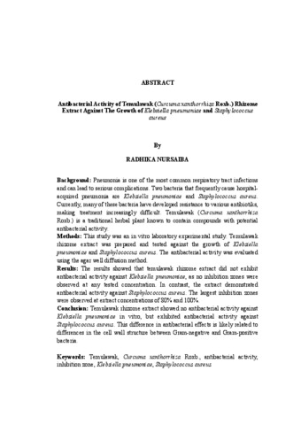 RADHIKA, NURSAIBA (2026) AKTIVITAS ANTIBAKTERI EKSTRAK RIMPANG TEMULAWAK(Curcuma xanthorrhiza Roxb.) TERHADAP PERTUMBUHAN BAKTERI Klebsiella pneumoniae DAN Staphylococcus aureus. FAKULTAS KEDOKTERAN, UNIVERSITAS LAMPUNG.