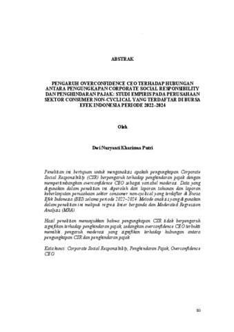 Penelitian ini bertujuan untuk menganalisis apakah pengungkapan Corporate Social Responsibility (CSR) berpengaruh terhadap penghindaran pajak dengan mempertimbangkan overconfidence CEO sebagai variabel moderasi. Data yang digunakan dalam penelitian ini diperoleh dari laporan tahunan dan laporan keberlanjutan perusahaan sektor consumer non-cyclical yang terdaftar di Bursa Efek Indonesia (BEI) selama periode 2022–2024. Metode analisis yang digunakan dalam penelitian ini meliputi regresi linier berganda dan Moderated Regression Analysis (MRA). Hasil penelitian menunjukkan bahwa pengungkapan CSR tidak berpengaruh signifikan terhadap penghindaran pajak, sedangkan overconfidence CEO terbukti memiliki pengaruh moderasi yang signifikan terhadap hubungan antara pengungkapan CSR dan penghindaran pajak. Kata kunci: Corporate Social Responsibility, Penghindaran Pajak, Overconfidence CEO. This study aims to analyze whether Corporate Social Responsibility (CSR) Disclosure influences Tax Avoidance by considering CEO Overconfidence as a moderating variable. The data used in this research were obtained from the annual and sustainability reports of non-cyclical consumer goods companies listed on the Indonesia Stock Exchange (IDX) during the 2022-2024 period. The analytical methods employed in this study include multiple linear regression and moderated regression analysis (MRA). The findings reveal that CSR disclosure has insignificant effect on Tax Avoidance, while CEO Overconfidence demonstrates a significant moderating effect on the relationship between CSR Disclosure and Tax Avoidance. Keywords: Corporate Social Responsibility, Tax Avoidance, Overconfidence CEO
