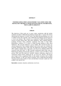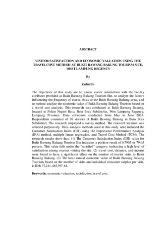 Tujuan pada penelitian ini untuk mengkaji kepuasan pengunjung terhadap atribut fasilitas yang dikeluarkan di Wisata Bukit Bawang Bakung, menganalisis faktorfaktor yang mempengaruhi frekuensi kunjungan wisatawan kawasan Wisata Bukit Bawang Bakung, dan menganalisis nilai ekonomi Wisata Bukit Bawang Bakung berdasarkan analisis biaya perjalanan Penelitian ini dilakukan di Bukit Bawang Bakung, Pekon Negeri Ratu, Kecamatan Batu Brak, Kabupaten Lampung Barat, Provinsi Lampung. Pengambilan data pada penelitian ini dilakukan pada Bulan Mei hingga Juni 2025. Responden adalah 76 pengunjung Bukit Bawang Bakung Kecamatan Batu Brak. Metode yang digunakan adalah metode survei. Penentuan lokasi penelitian dilakukan secara sengaja (Purposive). Metode analisis data yang digunakan adalah Customer Satisfaction Index (CSI) dengan metode Importance Performance Analysis (IPA), regresi linear berganda, dan metode biaya perjalanan. Hasil penelitian menunjukkan bahwa: (1) Nilai Customer Satisfaction Index (CSI) pada Wisata Bukit Bawang Bakung menunjukkan hasil yang positif dengan nilai sebesar 0,7905 atau 79,05%. Nilai ini masuk ke dalam kriteria "puas", yang mengindikasikan tingkat kepuasan yang tinggi dari para wisatawan yang berkunjung ke Wisata Bukit Bawang Bakung, (2) Faktor biaya perjalanan, jarak, dan pendapatan menunjukkan pengaruh yang signifikan terhadap jumlah kunjungan wisatawan ke Wisata Bukit Bawang Bakung, (3) Nilai ekonomi total per tahun untuk Wisata Bukit Bawang Bakung berdasarkan jumlah kunjungan dan surplus konsumen individu per kunjungan sebesar Rp37.241.485.397,84. Kata kunci : biaya perjalanan, kepuasan, valuasi ekonomi