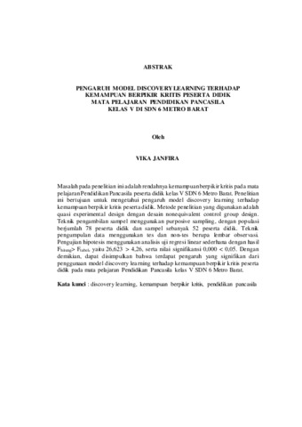 VIKA, JANFIRA (2026) PENGARUH MODEL DISCOVERY LEARNING TERHADAP KEMAMPUAN BERPIKIR KRITIS PESERTA DIDIK MATA PELAJARAN PENDIDIKAN PANCASILA KELAS V DI SDN 6 METRO BARAT. FAKULTAS KEGURUAN DAN ILMU PENDIDIKAN, UNIVERSITAS LAMPUNG.