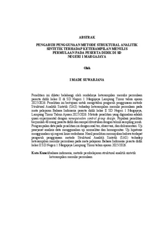 I MADE , SUWARJANA (2025) PENGARUH PENGGUNAAN METODE STRUKTURAL ANALITIK SINTETIK TERHADAP KETERAMPILAN MENULIS PERMULAAN PADA PESERTA DIDIK DI SD NEGERI 1 MARGAJAYA. FAKULTAS KEGURUAN DAN ILMU PENDIDIKAN, UNIVERSITAS LAMPUNG.