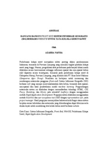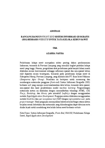Perkebunan kelapa sawit merupakan sektor penting dalam perekonomian Indonesia, termasuk di Provinsi Lampung yang memiliki tingkat produksi kelapa sawit yang tinggi. Namun, pengelolaan data perkebunan pada banyak lokasi masih dilakukan secara konvensional sehingga informasi spasial dan non-spasial kebun sulit dipantau secara terintegrasi, termasuk pada perkebunan kelapa sawit di Kabupaten Mesuji, Provinsi Lampung, yang dikelola oleh PT. Bina Sawit Makmur (Sampoerna Agro Group). Penelitian ini bertujuan untuk merancang dan membangun antarmuka pengguna (front-end) Sistem Informasi Geografis (SIG) berbasis web yang mampu memvisualisasikan data kebun, termasuk data spasial, non-spasial dan hasil pendeteksian model machine learning. Pengembangan antarmuka sistem ini dilakukan dengan memanfaatkan teknologi HTML, CSS, Vue.js, Bootstrap, dan library peta interaktif Leaflet.js dengan menggunakan metode Rapid Application Development. Pengujian sistem dilakukan menggunakan metode black box dan user acceptance test (UAT) dengan representative user, yaitu project manager. Hasil pengujian menunjukkan bahwa seluruh fungsi utama sistem berjalan sesuai kebutuhan dan antarmuka yang dikembangkan dapat diterima serta dinilai layak untuk mendukung tata kelola kebun sawit berbasis website. Kata Kunci: Sistem Informasi Geografis, Front-End, WebGIS, Perkebunan Kelapa Sawit, Rapid Application Development Palm oil plantations are an important sector in the Indonesian economy, including in Lampung which has a high level of oil palm production. However, plantation data management in many locations is still carried out conventionally so that spatial and non-spatial information of plantations are difficult to monitor integrally, including oil palm plantations in Mesuji, Lampung, managed by PT. Bina Sawit Makmur (Sampoerna Agro Group). This research aims to design and deploy a web-based front-end geographical information system that is capable of visualizing garden data, including spatial, non-spatial data and machine learning model detection results. Development of the system interface was made using HTML, CSS, Vue.js, Bootstrap, and Leaflet.js, interactive map libraries, using the Rapid Application Development method. System testing is carried out using the black box method and user acceptance test (UAT) with a representative user, who is the project manager. The results of the test show that all major functions of the system run according to the needs and developed interfaces are acceptable and considered worthy to support the management of website-based palm plantations. Keywords: Geographic Information System, Front-End, WebGIS, Palm Oil Plantation, Rapid Application Development
