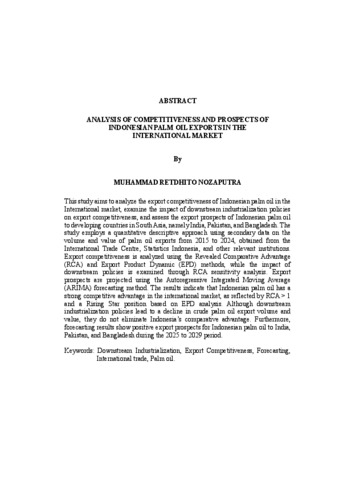 This study aims to analyze the export competitiveness of Indonesian palm oil in the International market, examine the impact of downstream industrialization policies on export competitiveness, and assess the export prospects of Indonesian palm oil to developing countries in South Asia, namely India, Pakistan, and Bangladesh. The study employs a quantitative descriptive approach using secondary data on the volume and value of palm oil exports from 2015 to 2024, obtained from the International Trade Centre, Statistics Indonesia, and other relevant institutions. Export competitiveness is analyzed using the Revealed Comparative Advantage (RCA) and Export Product Dynamic (EPD) methods, while the impact of downstream policies is examined through RCA sensitivity analysis. Export prospects are projected using the Autoregressive Integrated Moving Average (ARIMA) forecasting method. The results indicate that Indonesian palm oil has a strong competitive advantage in the international market, as reflected by RCA > 1 and a Rising Star position based on EPD analysis. Although downstream industrialization policies lead to a decline in crude palm oil export volume and value, they do not eliminate Indonesia’s comparative advantage. Furthermore, forecasting results show positive export prospects for Indonesian palm oil to India, Pakistan, and Bangladesh during the 2025 to 2029 period. Keywords: Downstream Industrialization, Export Competitiveness, Forecasting, International trade, Palm oil. Penelitian ini bertujuan untuk menganalisis daya saing ekspor minyak kelapa sawit Indonesia di pasar internasional, mengkaji pengaruh kebijakan hilirisasi terhadap daya saing ekspor, serta menganalisis prospek ekspor minyak kelapa sawit Indonesia ke negara-negara berkembang di Asia Selatan: India, Pakistan, dan Bangladesh. Penelitian ini menggunakan metode deskriptif kuantitatif dengan data sekunder seperti data volume dan nilai ekspor minyak kelapa sawit periode 2015 sampai 2024, bersumber dari International Trade Centre, Badan Pusat Statistik, serta instansi terkait lainnya. Analisis daya saing ekspor menggunakan metode Revealed Comparative Advantage (RCA) dan Export Product Dynamic (EPD), sedangkan pengaruh kebijakan hilirisasi dianalisis melalui analisis sensitivitas RCA. Prospek ekspor dianalisis menggunakan metode peramalan Autoregressive Integrated Moving Average (ARIMA). Hasil penelitian menunjukkan bahwa minyak kelapa sawit Indonesia memiliki daya saing yang sangat kuat di pasar internasional dengan nilai RCA > 1 dan posisi pasar berada pada kategori Rising Star. Kebijakan hilirisasi berdampak pada penurunan volume dan nilai ekspor CPO, namun tidak menghilangkan keunggulan komparatif Indonesia. Hasil peramalan menunjukkan bahwa ekspor minyak kelapa sawit Indonesia ke India, Pakistan, dan Bangladesh memiliki prospek yang positif pada periode 2025 sampai 2029. Kata kunci: Daya Saing, Ekspor, Hilirisasi, Minyak Kelapa Sawit, Peramalan.