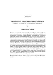 This study investigates the optimization of the Vehicle Routing Problem (VRP) with capacity constraints using a Genetic Algorithm (GA). The case study data were obtained from a distribution company in Bandar Lampung serving 20 customers with varying demands measured in kilograms and motorcycle engine capacity (cc). All distribution routes are assumed to be feasible for land transportation, including routes crossing water areas via connecting routes such as bridges or ferry crossings. The problem is formulated using Integer Linear Programming (ILP) with the ob- jective of minimizing total travel time, driver rest time, and penalties for capacity violations. The Genetic Algorithm implementation includes population initializa- tion, selection, crossover, mutation, and fitness evaluation. The results show that the Genetic Algorithm produces efficient distribution routes with a fleet allocation of three Colt Diesel vehicles (2000 kg), one Double Diesel vehicle (5000 kg), and two towing vehicles. The best solution yields a total travel time of 16 days 22 hours 4 minutes with routes: Colt Diesel 1: depot–9–13–15–14–12–5–7–8–depot, Colt Diesel 2: depot–6–4–2–3–1–10–depot, Double Diesel: depot–20–depot, and Tow- ing 1: depot–17–19–16–18–depot, while Towing 2 and Colt Diesel 3 are not oper- ated because all demands have been optimally satisfied. Keywords: Vehicle Routing Problem, Capacity, Genetic Algorithm, Route Opti- mization. Penelitian ini membahas optimasi Vehicle Routing Problem (VRP) dengan kendala kapasitas menggunakan Algoritma Genetika (AG). Data penelitian berasal dari per- usahaan distribusi di Kota Bandar Lampung dengan 20 pelanggan yang memiliki permintaan bervariasi dalam satuan kilogram dan kendaraan bermotor (cc). Selu- ruh rute distribusi diasumsikan feasible bagi kendaraan darat, termasuk rute yang melintasi wilayah perairan melalui jalur penghubung seperti jembatan atau penye- berangan. Permasalahan dimodelkan menggunakan Integer Linear Programming (ILP) dengan fungsi tujuan meminimalkan total waktu perjalanan, waktu istirahat pengemudi, serta penalti pelanggaran kapasitas. Implementasi Algoritma Genetika meliputi inisialisasi populasi, seleksi, crossover, mutasi, dan evaluasi fitness. Hasil penelitian menunjukkan bahwa AG menghasilkan rute distribusi yang efisien de- ngan alokasi armada tiga unit Colt Diesel (2000 kg), satu unit Double Diesel (5000 kg), dan dua unit towing. Solusi terbaik memberikan total waktu perjalanan 16 hari 22 jam 4 menit dengan rute Colt Diesel 1: depot–9–13–15–14–12–5–7–8–depot, Colt Diesel 2: depot–6–4–2–3–1–10–depot, Double Diesel: depot–20–depot, serta Towing 1: depot–17–19–16–18–depot, sementara Towing 2 dan Colt Diesel 3 tidak dioperasikan karena seluruh permintaan telah terpenuhi. Kata-kata kunci: Vehicle Routing Problem, Capacitated VRP, Algoritma Geneti- ka, Optimasi Rute, Logistik.