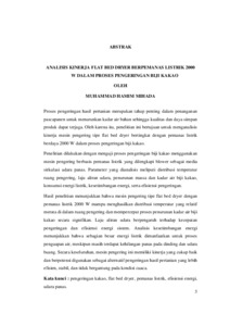Proses pengeringan hasil pertanian merupakan tahap penting dalam penanganan pascapanen untuk menurunkan kadar air bahan sehingga kualitas dan daya simpan produk dapat terjaga. Oleh karena itu, penelitian ini bertujuan untuk menganalisis kinerja mesin pengering tipe flat bed dryer bertingkat dengan pemanas listrik berdaya 2000 W dalam proses pengeringan biji kakao. Penelitian dilakukan dengan menguji proses pengeringan biji kakao menggunakan mesin pengering berbasis pemanas listrik yang dilengkapi blower sebagai media sirkulasi udara panas. Parameter yang dianalisis meliputi distribusi temperatur ruang pengering, laju aliran udara, penurunan massa dan kadar air biji kakao, konsumsi energi listrik, kesetimbangan energi, serta efisiensi pengeringan. Hasil penelitian menunjukkan bahwa mesin pengering tipe flat bed dryer dengan pemanas listrik 2000 W mampu menghasilkan distribusi temperatur yang relatif merata di dalam ruang pengering dan mempercepat proses penurunan kadar air biji kakao secara signifikan. Laju aliran udara berpengaruh terhadap kecepatan pengeringan dan efisiensi energi sistem. Analisis kesetimbangan energi menunjukkan bahwa sebagian besar energi listrik dimanfaatkan untuk proses penguapan air, meskipun masih terdapat kehilangan panas pada dinding dan udara buang. Secara keseluruhan, mesin pengering ini memiliki kinerja yang cukup baik dan berpotensi digunakan sebagai alternatif pengeringan hasil pertanian yang lebih efisien, stabil, dan tidak bergantung pada kondisi cuaca. Kata kunci : pengeringan kakao, flat bed dryer, pemanas listrik, efisiensi energi, udara panas. The agricultural drying process is an important stage in post-harvest handling to reduce the moisture content of materials so that product quality and shelf life can be maintained. Therefore, this study aims to analyze the performance of a multilevel flat bed dryer equipped with a 2000 W electric heater in the cocoa bean drying process. The study was conducted by testing the cocoa bean drying process using an electricheater-based drying machine equipped with a blower as a hot air circulation medium. The analyzed parameters included temperature distribution inside the drying chamber, air flow rate, reduction in mass and moisture content of cocoa beans, electrical energy consumption, energy balance, and drying efficiency. The results show that the flat bed dryer with a 2000 W electric heater is able to produce a relatively uniform temperature distribution inside the drying chamber and significantly accelerate the reduction of cocoa bean moisture content. The air flow rate affects the drying rate and the energy efficiency of the system. Energy balance analysis indicates that most of the electrical energy is utilized for the water evaporation process, although heat losses still occur through the walls and exhaust air. Overall, this drying machine demonstrates good performance and has the potential to be used as an alternative agricultural drying system that is more efficient, stable, and independent of weather conditions. Keywords: cocoa drying, flat bed dryer, electric heater, energy efficiency, hot air.